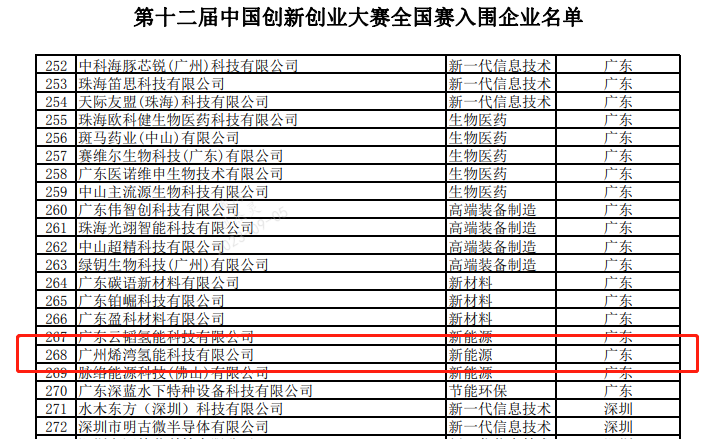 9月5日,中國創新創業大賽組委會公示了第十二屆中國創新創業大賽全國賽入圍企業名單,烯灣氫能科技有限公司以 廣東賽區第二名的優異成績,成功晉級國賽,展現了其在氫能源領域的領先優勢和發展潛力。